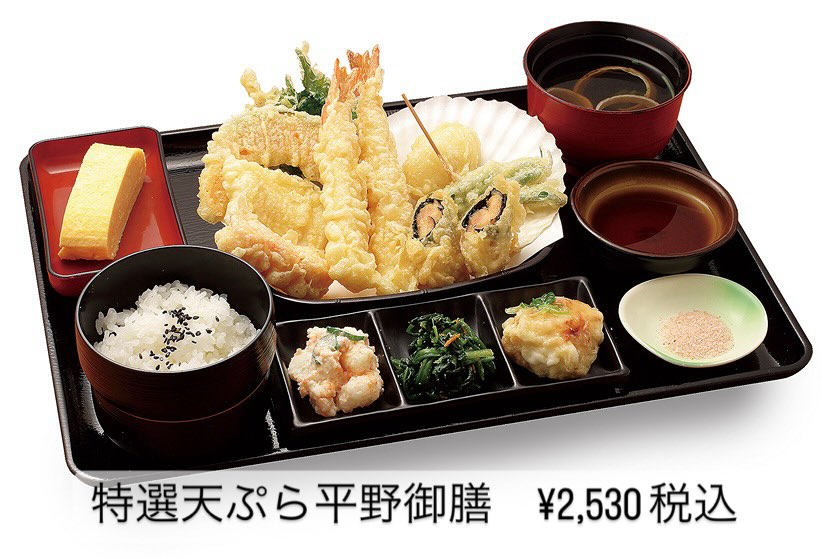 【特選天ぷら平野御膳】 海老天二尾•鶏のり巻き天•ほたて天• […]
